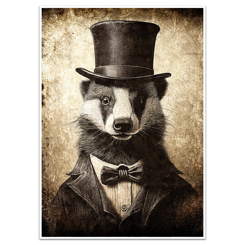 This delightful print features Amos, a distinguished badger, captured in a vintage Victorian-style portrait wearing a top hat, suit, and bow tie. Combining whimsical charm with classic elegance, it evokes the playful sophistication of a bygone era. Perfect for offices, living rooms, or study spaces, this piece adds character and timeless style to any décor.