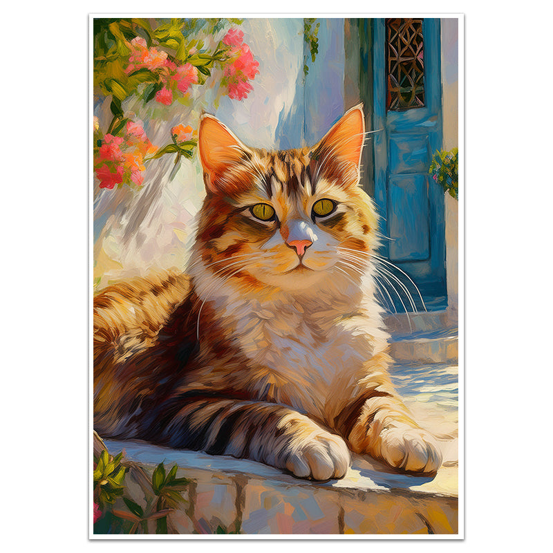 Bask in the warmth of the Mediterranean sun with this beautiful cat art print. Featuring a fluffy tabby cat lounging in a picturesque Greek island setting, complete with a classic blue door and vibrant bougainvillea, this painterly piece brings a touch of summer holiday charm to any room.
