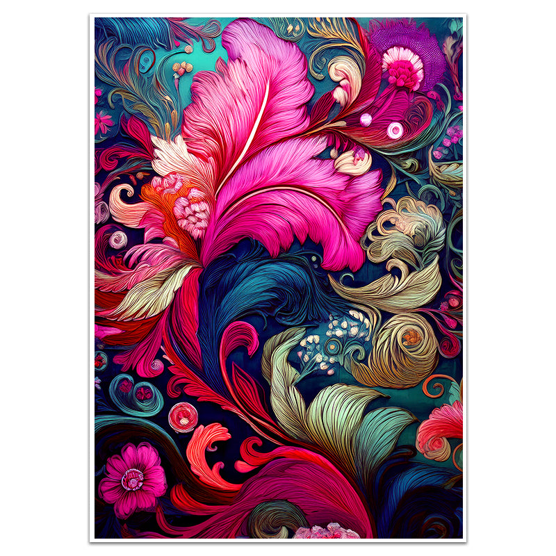 This detailed bohemian floral print showcases stunning 3D-inspired blooms with intricate textures and vibrant, rich hues. Bursting with artistic detail and dynamic depth, it brings a lively, free-spirited energy to any space while celebrating the beauty of nature in full bloom. Perfect for living rooms, bedrooms or creative studios.