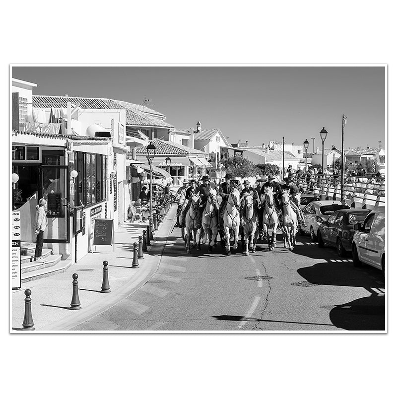 Feel the thunderous energy of a timeless tradition with "White Horses," a stunning black and white photograph. A procession of majestic white horses and their riders commands the sun-drenched street of a European seaside town. This powerful, documentary-style shot captures the raw energy and cultural richness of a unique moment in time.